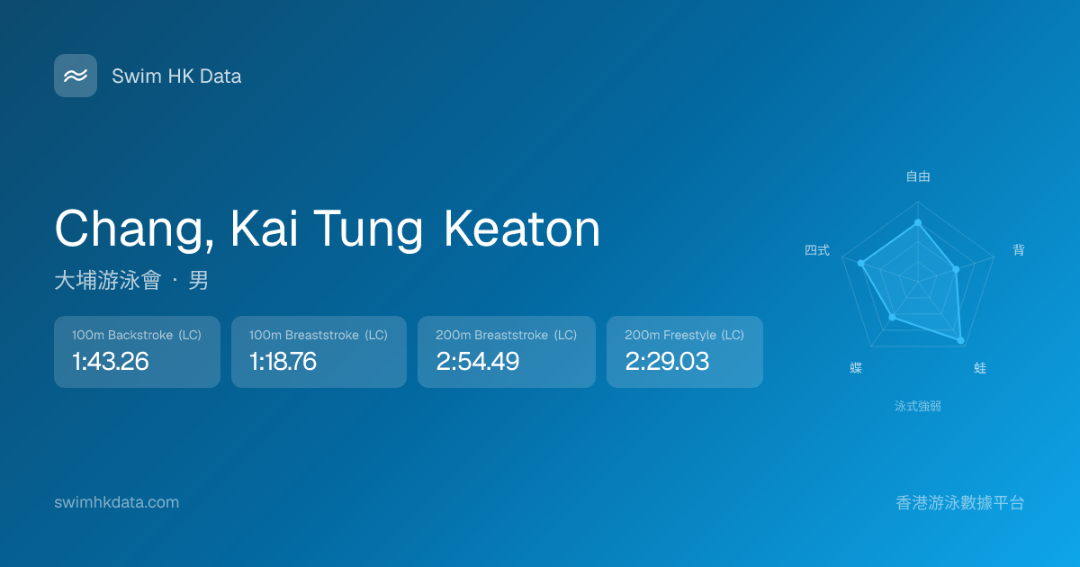 此圖表根據你所有比賽成績計算,顯示你在各泳式的相對強弱,僅供參考。繼續努力,每一次練習都會讓你更快更強!💪