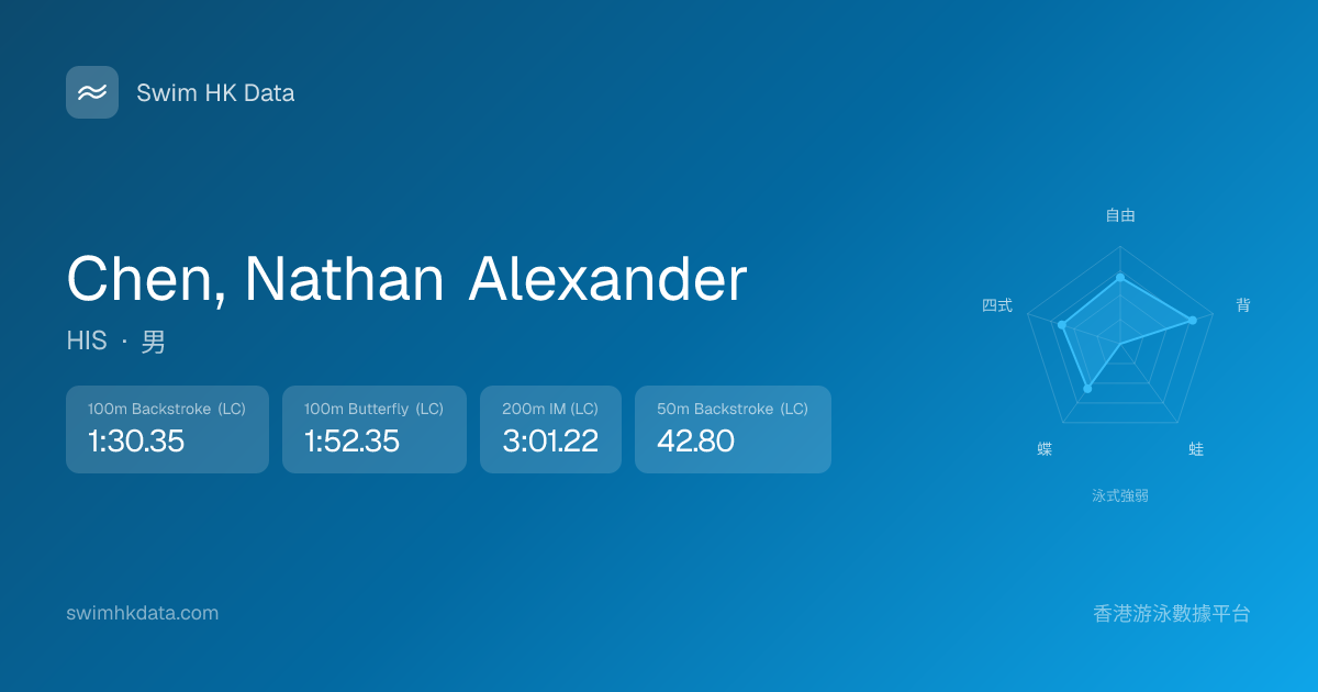 此圖表根據你所有比賽成績計算,顯示你在各泳式的相對強弱,僅供參考。繼續努力,每一次練習都會讓你更快更強!💪