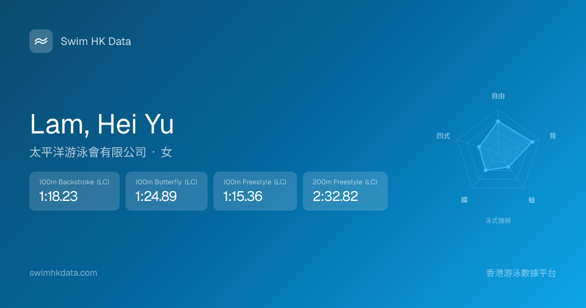 此圖表根據你所有比賽成績計算,顯示你在各泳式的相對強弱,僅供參考。繼續努力,每一次練習都會讓你更快更強!💪