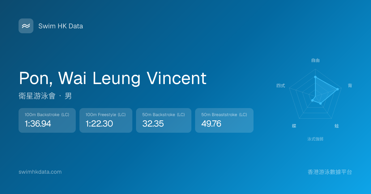 此圖表根據你所有比賽成績計算,顯示你在各泳式的相對強弱,僅供參考。繼續努力,每一次練習都會讓你更快更強!💪