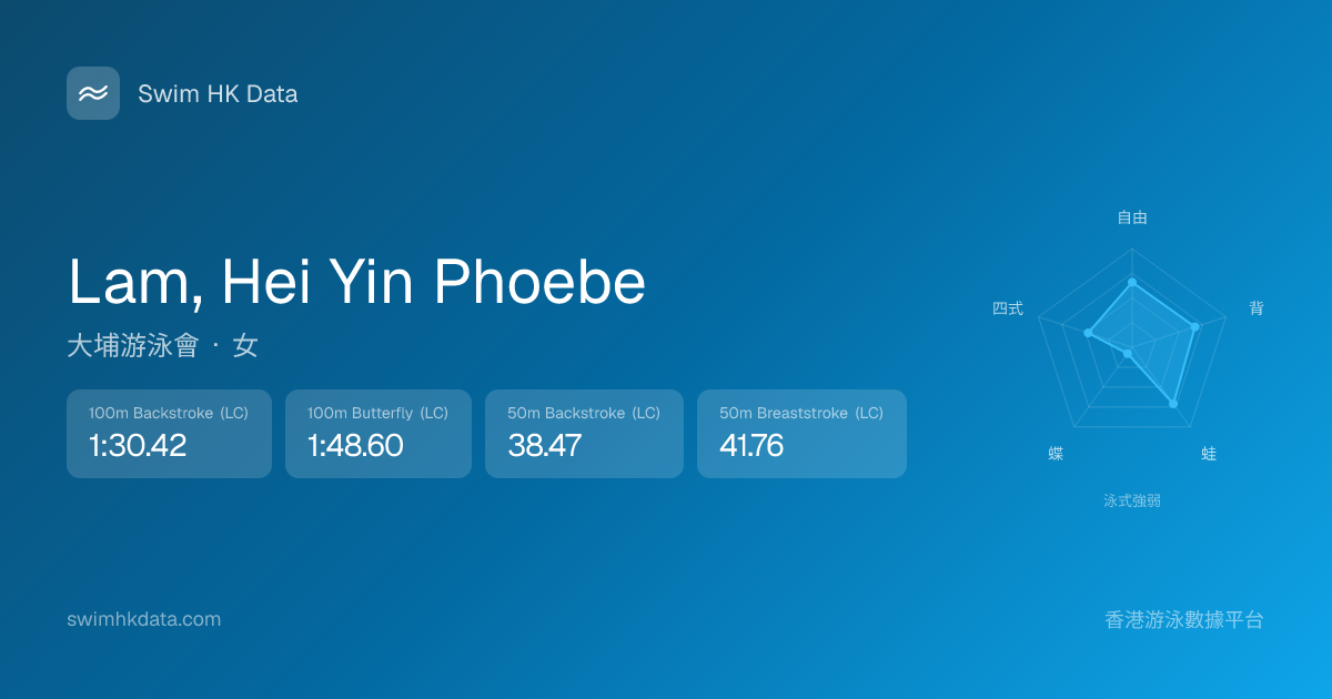 此圖表根據你所有比賽成績計算,顯示你在各泳式的相對強弱,僅供參考。繼續努力,每一次練習都會讓你更快更強!💪