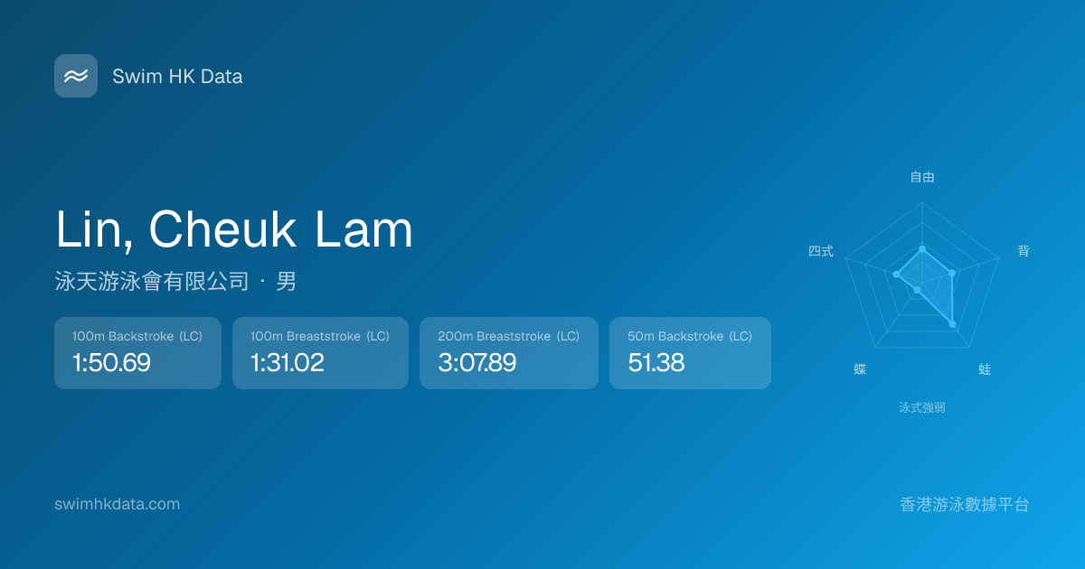 此圖表根據你所有比賽成績計算,顯示你在各泳式的相對強弱,僅供參考。繼續努力,每一次練習都會讓你更快更強!💪