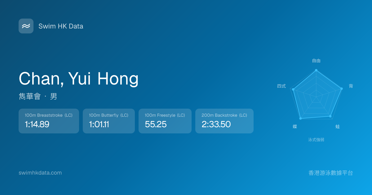 此圖表根據你所有比賽成績計算,顯示你在各泳式的相對強弱,僅供參考。繼續努力,每一次練習都會讓你更快更強!💪
