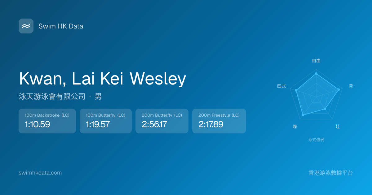 此圖表根據你所有比賽成績計算,顯示你在各泳式的相對強弱,僅供參考。繼續努力,每一次練習都會讓你更快更強!💪