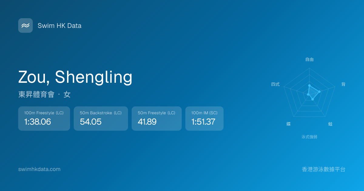 此圖表根據你所有比賽成績計算,顯示你在各泳式的相對強弱,僅供參考。繼續努力,每一次練習都會讓你更快更強!💪