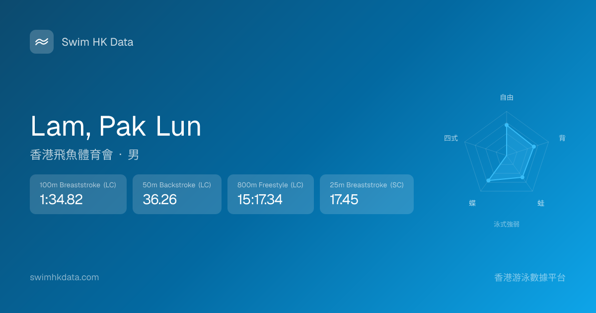 此圖表根據你所有比賽成績計算,顯示你在各泳式的相對強弱,僅供參考。繼續努力,每一次練習都會讓你更快更強!💪