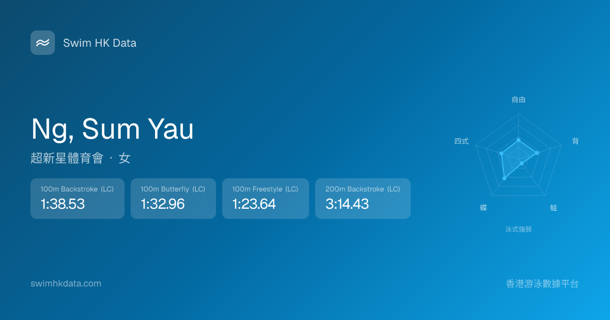 此圖表根據你所有比賽成績計算,顯示你在各泳式的相對強弱,僅供參考。繼續努力,每一次練習都會讓你更快更強!💪