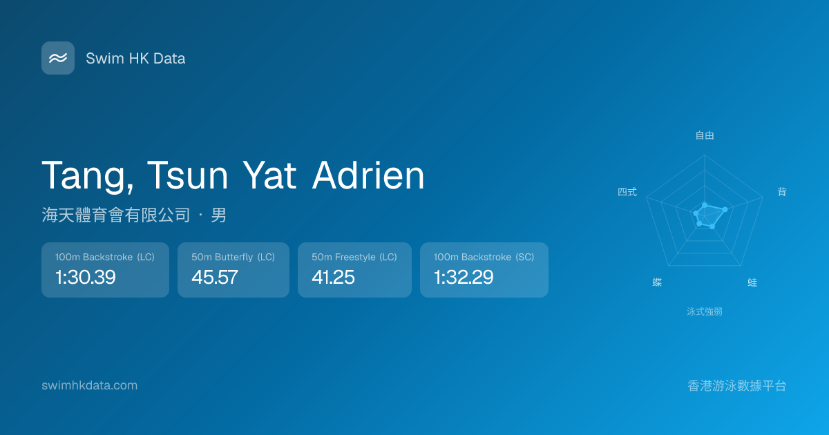 此圖表根據你所有比賽成績計算,顯示你在各泳式的相對強弱,僅供參考。繼續努力,每一次練習都會讓你更快更強!💪