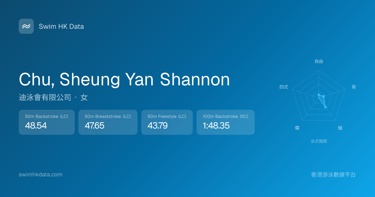 此圖表根據你所有比賽成績計算,顯示你在各泳式的相對強弱,僅供參考。繼續努力,每一次練習都會讓你更快更強!💪