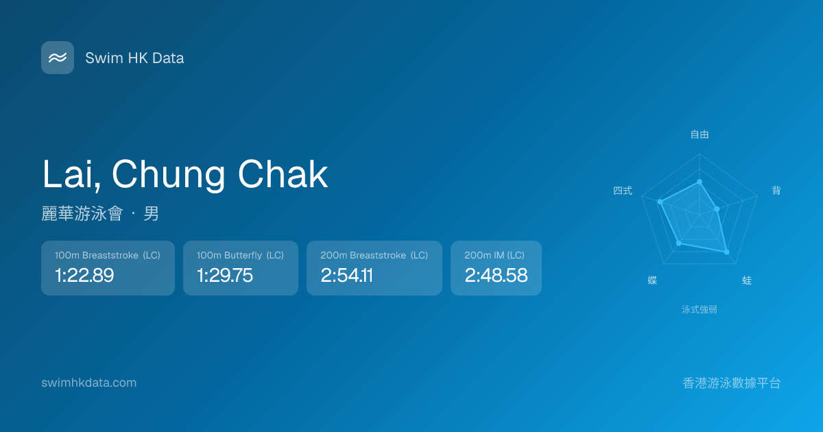此圖表根據你所有比賽成績計算,顯示你在各泳式的相對強弱,僅供參考。繼續努力,每一次練習都會讓你更快更強!💪