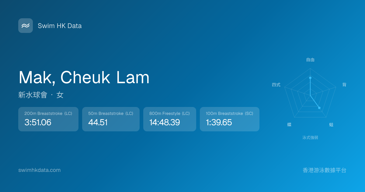 此圖表根據你所有比賽成績計算,顯示你在各泳式的相對強弱,僅供參考。繼續努力,每一次練習都會讓你更快更強!💪