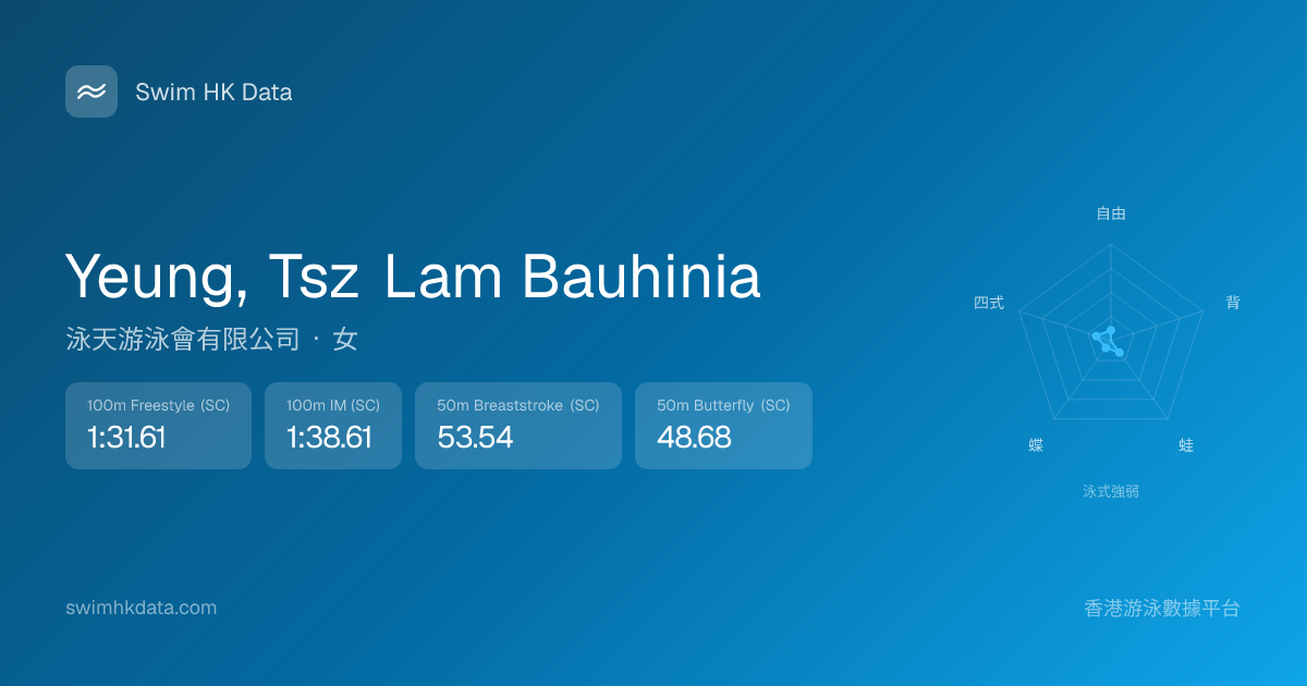 此圖表根據你所有比賽成績計算,顯示你在各泳式的相對強弱,僅供參考。繼續努力,每一次練習都會讓你更快更強!💪