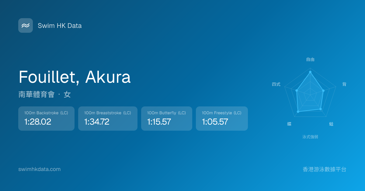 此圖表根據你所有比賽成績計算,顯示你在各泳式的相對強弱,僅供參考。繼續努力,每一次練習都會讓你更快更強!💪