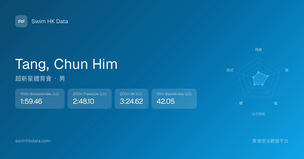 此圖表根據你所有比賽成績計算,顯示你在各泳式的相對強弱,僅供參考。繼續努力,每一次練習都會讓你更快更強!💪