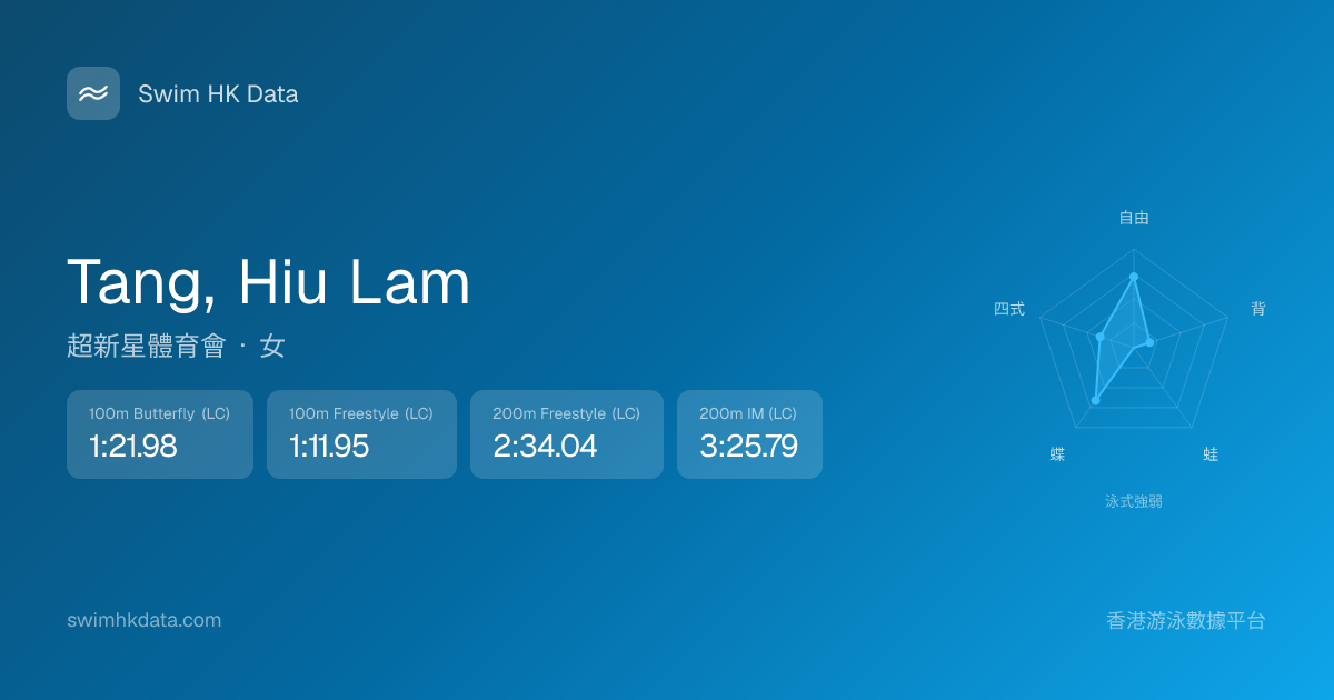 此圖表根據你所有比賽成績計算,顯示你在各泳式的相對強弱,僅供參考。繼續努力,每一次練習都會讓你更快更強!💪