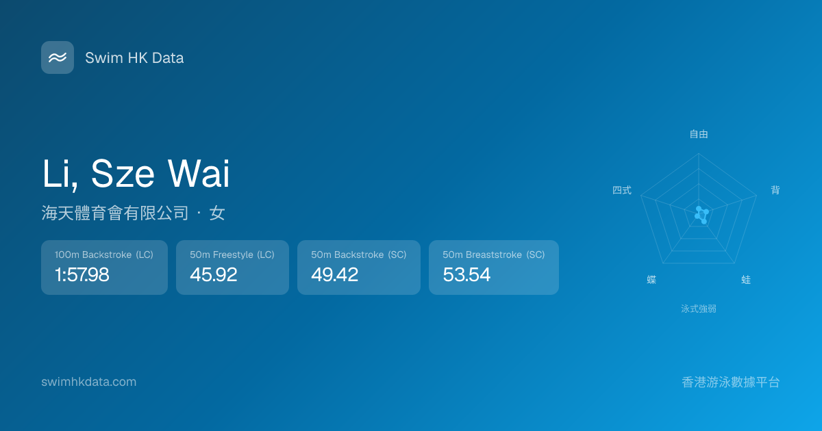 此圖表根據你所有比賽成績計算,顯示你在各泳式的相對強弱,僅供參考。繼續努力,每一次練習都會讓你更快更強!💪
