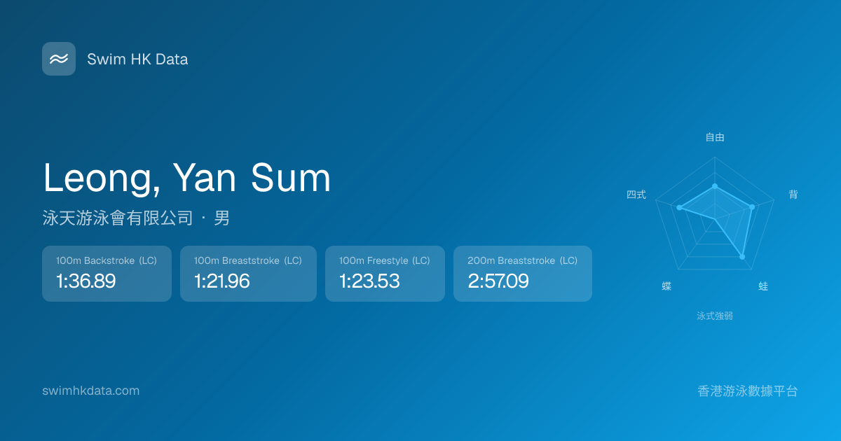 此圖表根據你所有比賽成績計算,顯示你在各泳式的相對強弱,僅供參考。繼續努力,每一次練習都會讓你更快更強!💪