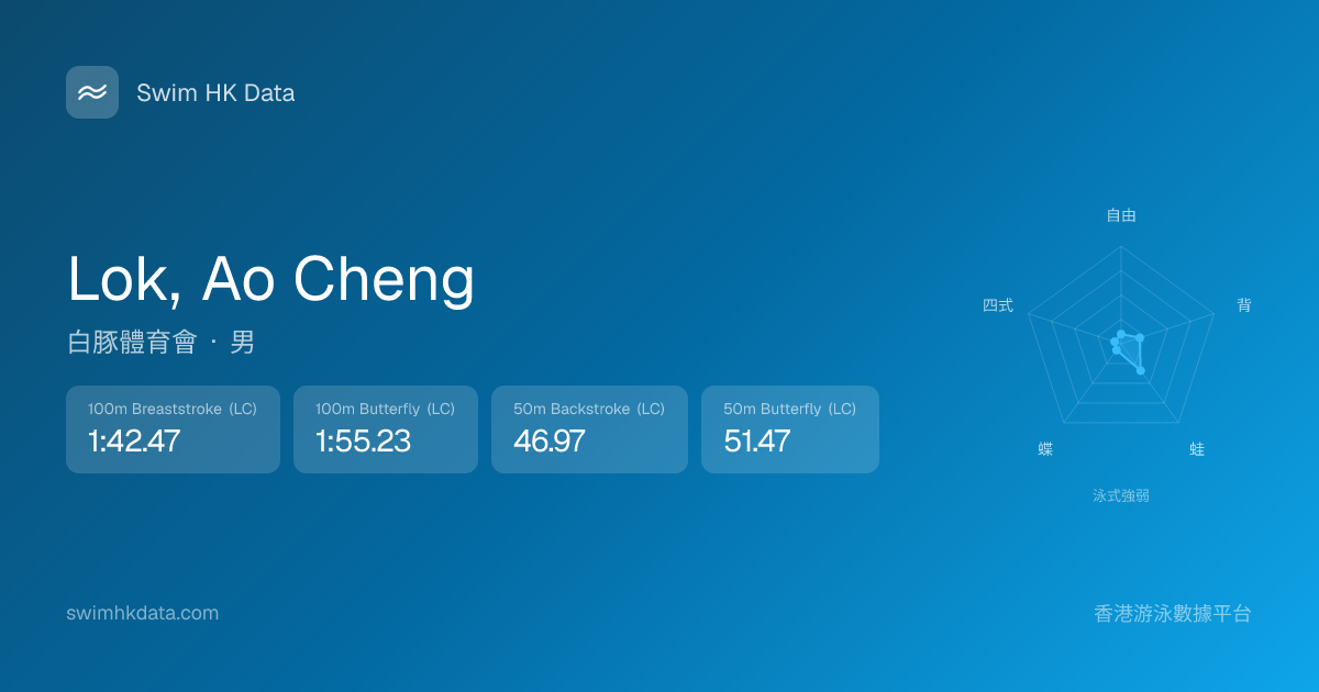 此圖表根據你所有比賽成績計算,顯示你在各泳式的相對強弱,僅供參考。繼續努力,每一次練習都會讓你更快更強!💪
