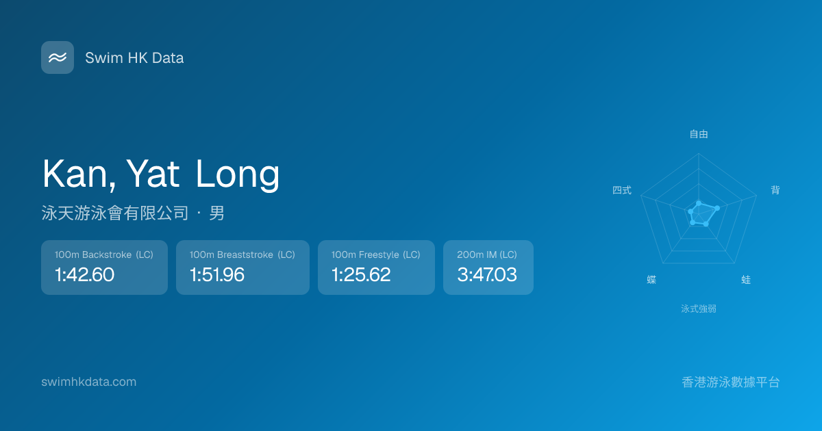 此圖表根據你所有比賽成績計算,顯示你在各泳式的相對強弱,僅供參考。繼續努力,每一次練習都會讓你更快更強!💪