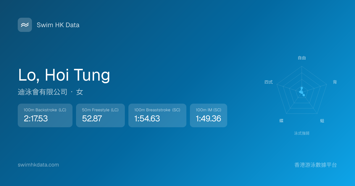 此圖表根據你所有比賽成績計算,顯示你在各泳式的相對強弱,僅供參考。繼續努力,每一次練習都會讓你更快更強!💪