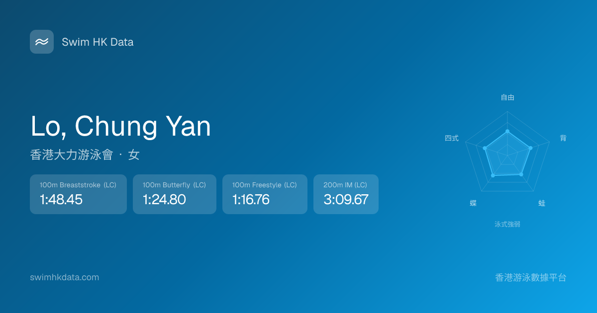 此圖表根據你所有比賽成績計算,顯示你在各泳式的相對強弱,僅供參考。繼續努力,每一次練習都會讓你更快更強!💪