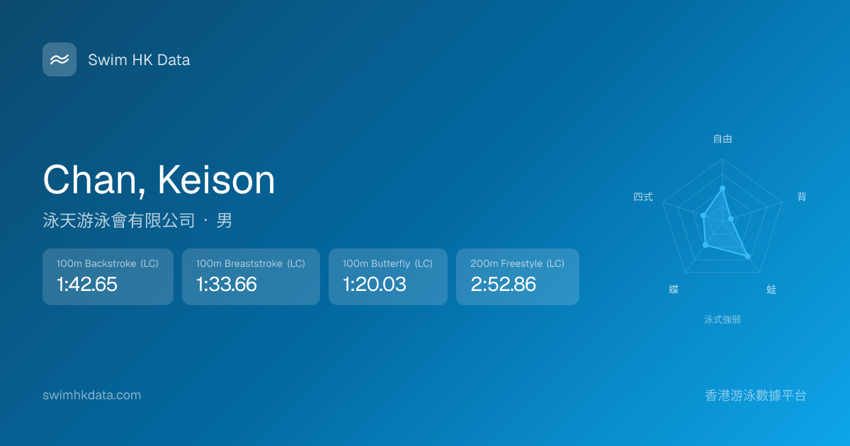 此圖表根據你所有比賽成績計算,顯示你在各泳式的相對強弱,僅供參考。繼續努力,每一次練習都會讓你更快更強!💪