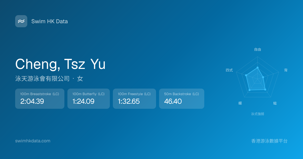 此圖表根據你所有比賽成績計算,顯示你在各泳式的相對強弱,僅供參考。繼續努力,每一次練習都會讓你更快更強!💪