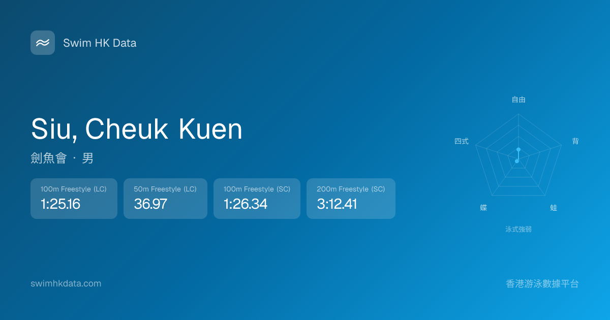 此圖表根據你所有比賽成績計算,顯示你在各泳式的相對強弱,僅供參考。繼續努力,每一次練習都會讓你更快更強!💪