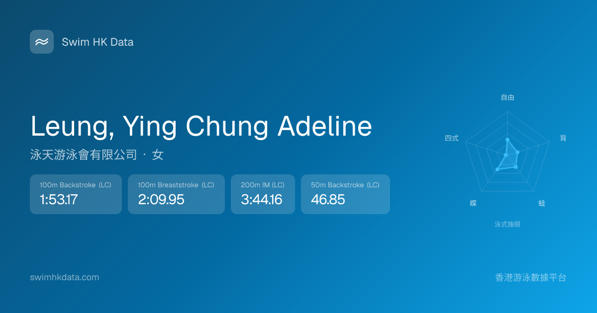 此圖表根據你所有比賽成績計算,顯示你在各泳式的相對強弱,僅供參考。繼續努力,每一次練習都會讓你更快更強!💪