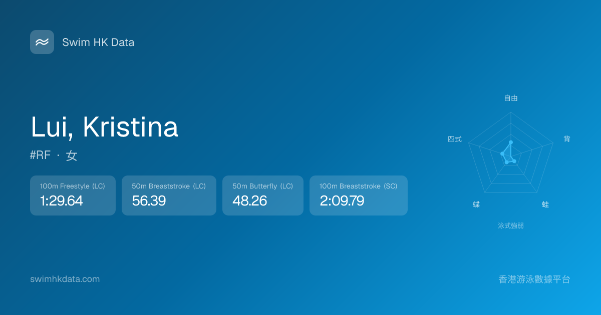 此圖表根據你所有比賽成績計算,顯示你在各泳式的相對強弱,僅供參考。繼續努力,每一次練習都會讓你更快更強!💪