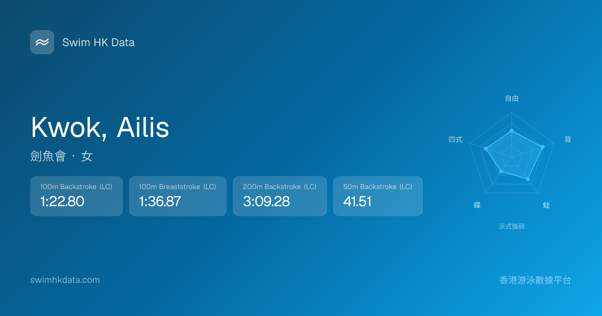 此圖表根據你所有比賽成績計算,顯示你在各泳式的相對強弱,僅供參考。繼續努力,每一次練習都會讓你更快更強!💪