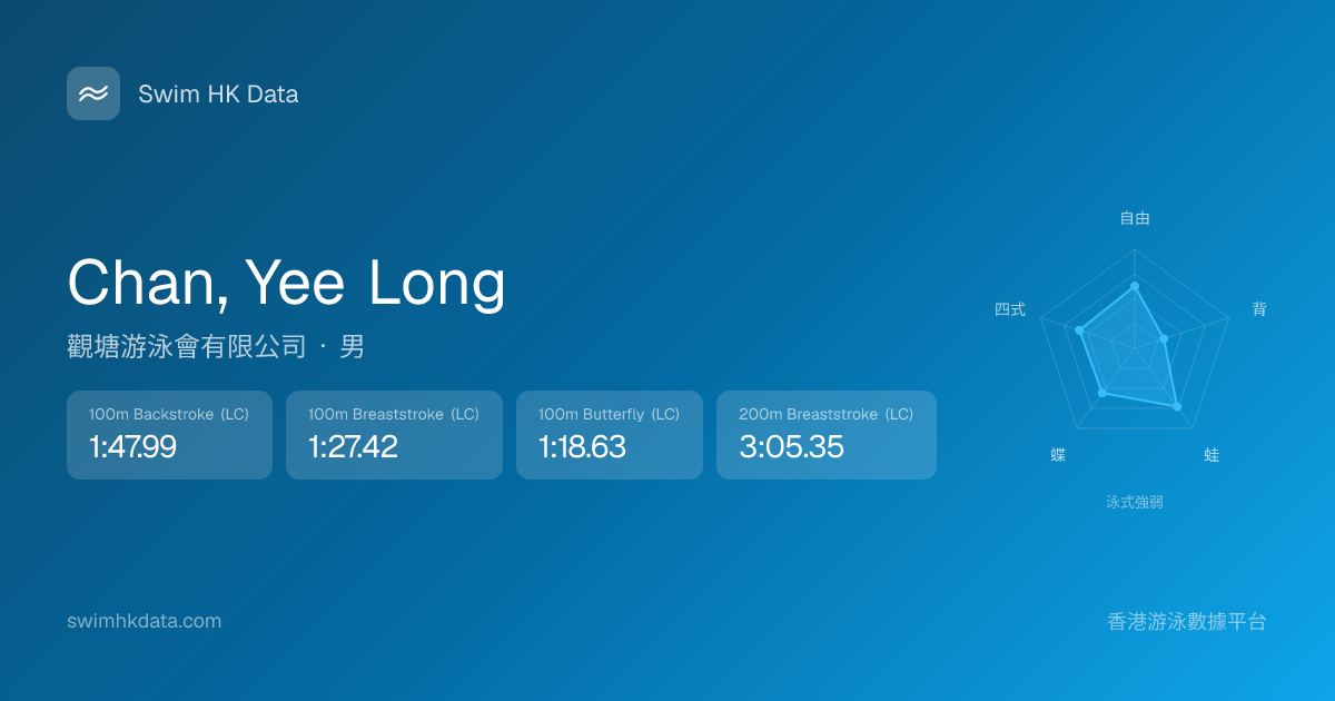 此圖表根據你所有比賽成績計算,顯示你在各泳式的相對強弱,僅供參考。繼續努力,每一次練習都會讓你更快更強!💪