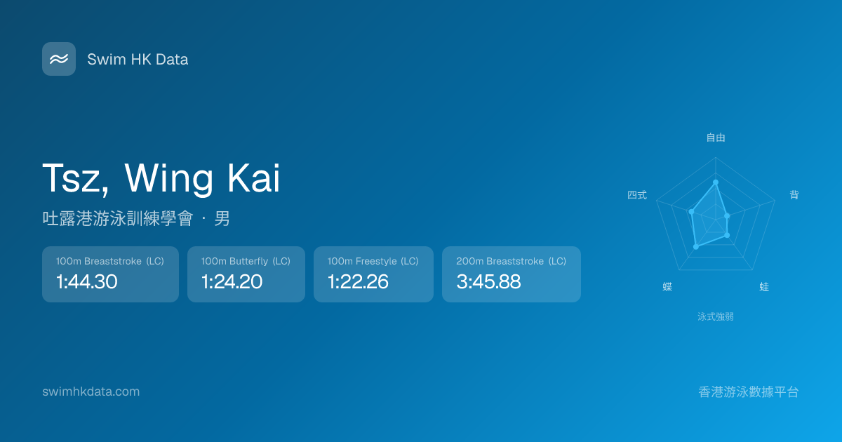 此圖表根據你所有比賽成績計算,顯示你在各泳式的相對強弱,僅供參考。繼續努力,每一次練習都會讓你更快更強!💪
