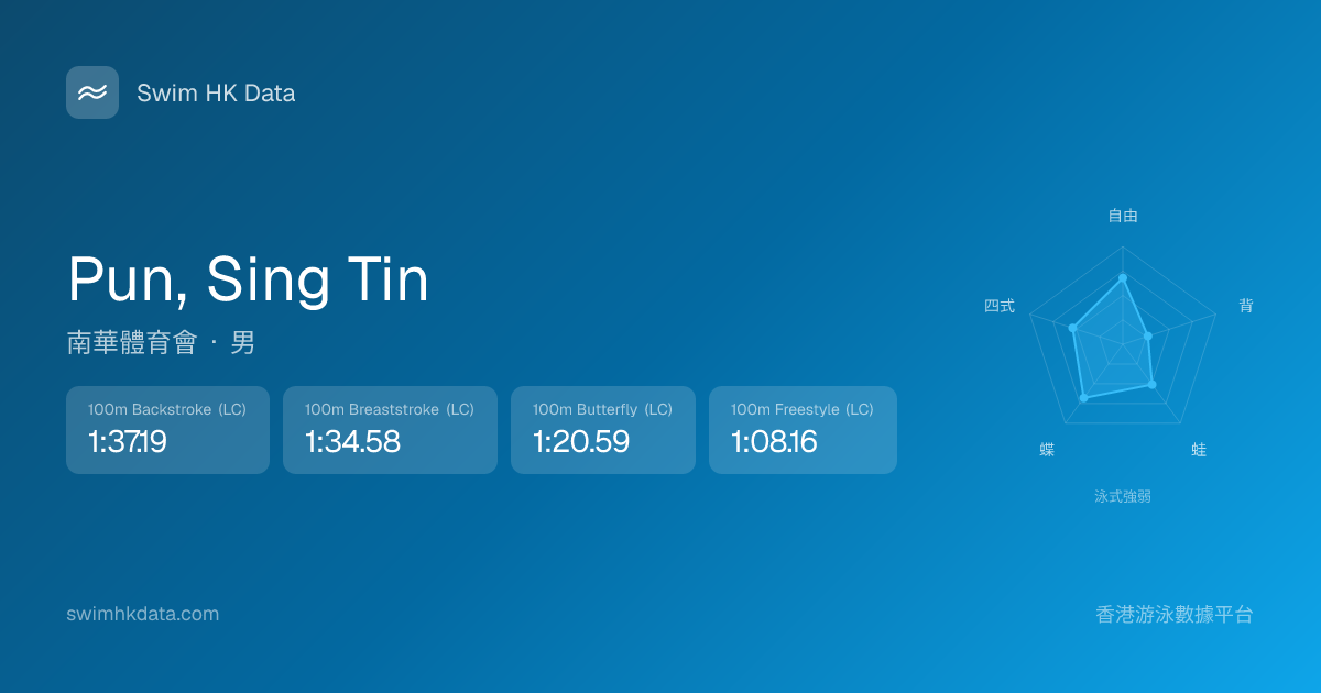 此圖表根據你所有比賽成績計算,顯示你在各泳式的相對強弱,僅供參考。繼續努力,每一次練習都會讓你更快更強!💪