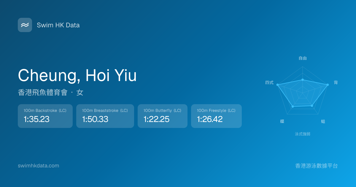 此圖表根據你所有比賽成績計算,顯示你在各泳式的相對強弱,僅供參考。繼續努力,每一次練習都會讓你更快更強!💪
