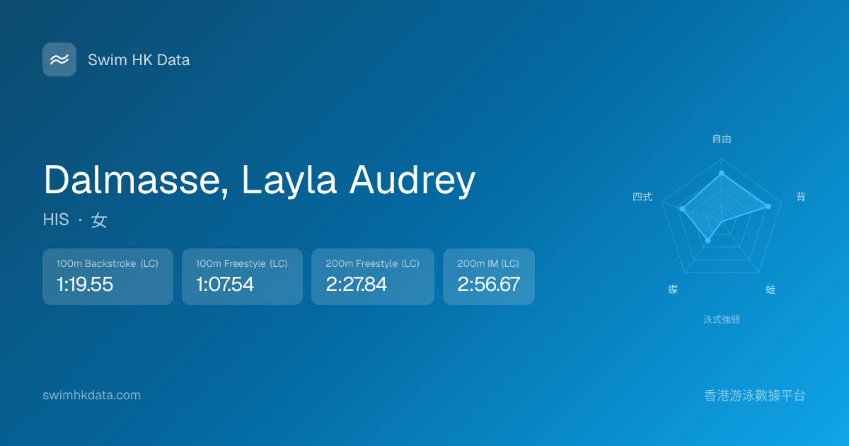 此圖表根據你所有比賽成績計算,顯示你在各泳式的相對強弱,僅供參考。繼續努力,每一次練習都會讓你更快更強!💪