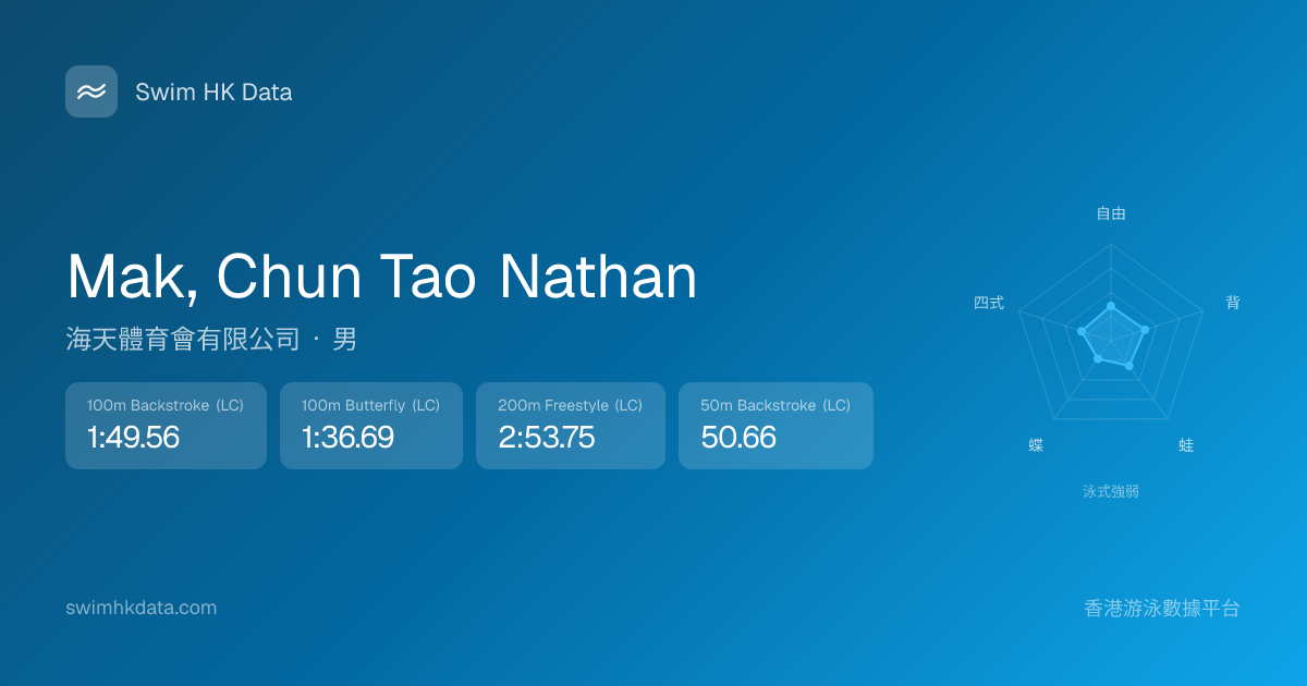 此圖表根據你所有比賽成績計算,顯示你在各泳式的相對強弱,僅供參考。繼續努力,每一次練習都會讓你更快更強!💪