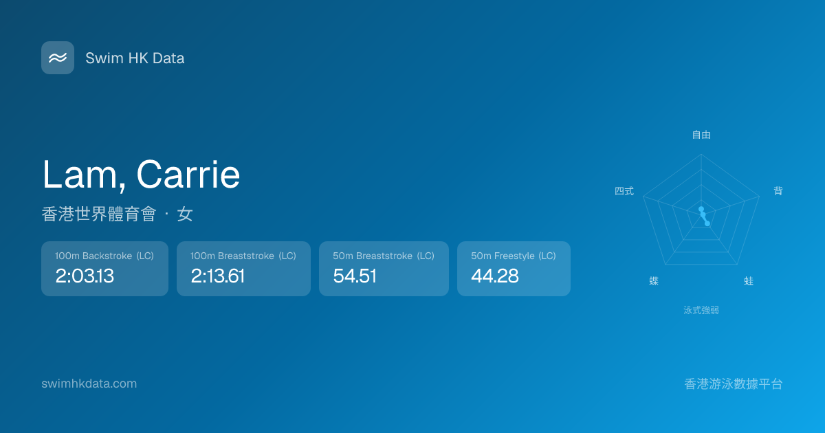 此圖表根據你所有比賽成績計算,顯示你在各泳式的相對強弱,僅供參考。繼續努力,每一次練習都會讓你更快更強!💪
