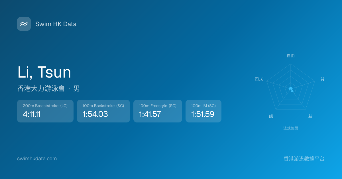 此圖表根據你所有比賽成績計算,顯示你在各泳式的相對強弱,僅供參考。繼續努力,每一次練習都會讓你更快更強!💪