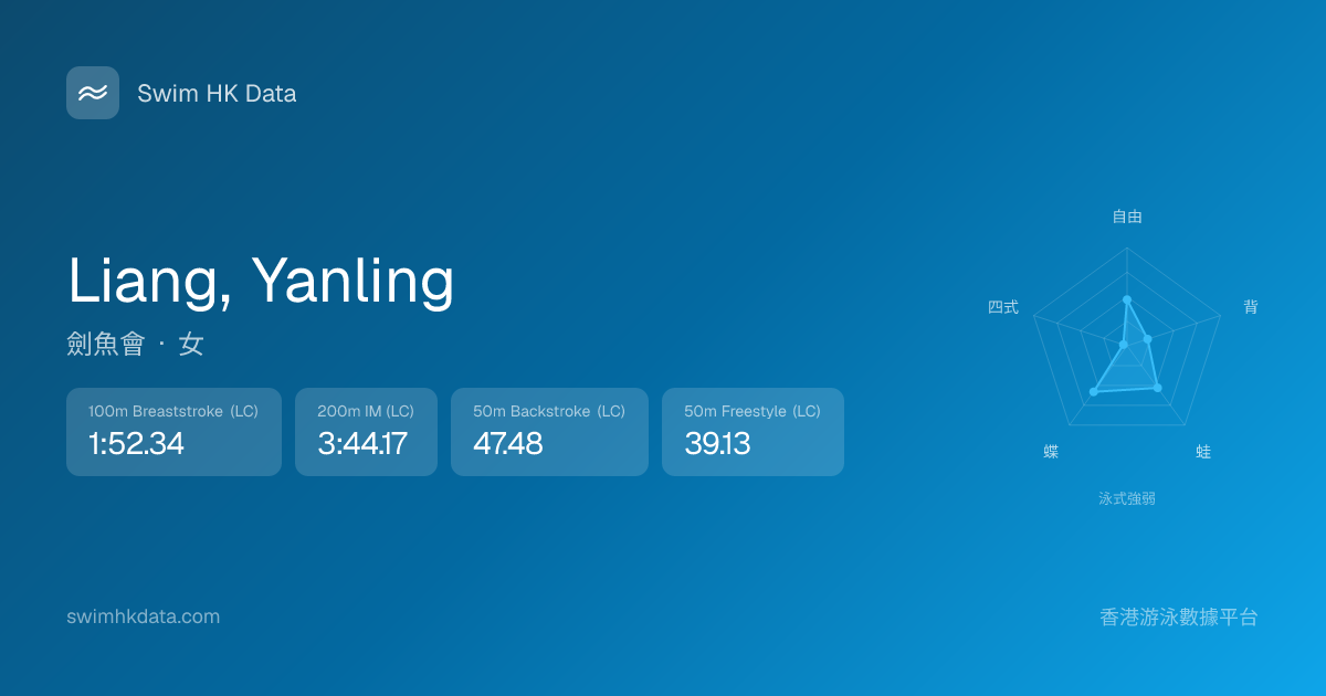 此圖表根據你所有比賽成績計算,顯示你在各泳式的相對強弱,僅供參考。繼續努力,每一次練習都會讓你更快更強!💪