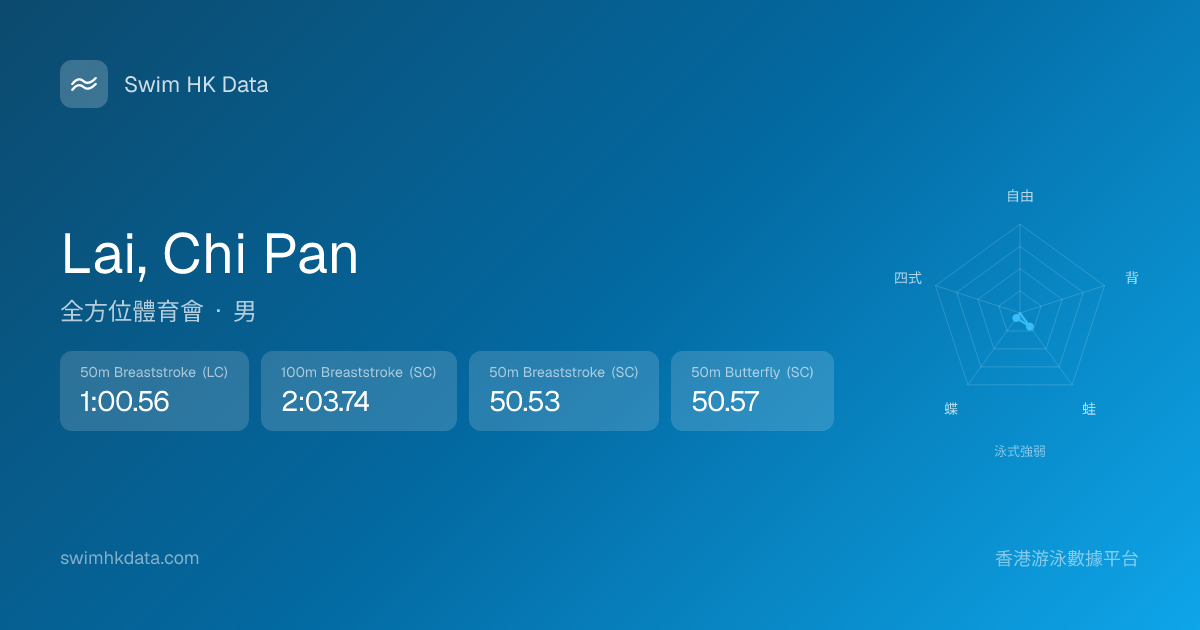 此圖表根據你所有比賽成績計算,顯示你在各泳式的相對強弱,僅供參考。繼續努力,每一次練習都會讓你更快更強!💪