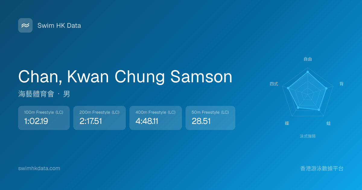 此圖表根據你所有比賽成績計算,顯示你在各泳式的相對強弱,僅供參考。繼續努力,每一次練習都會讓你更快更強!💪
