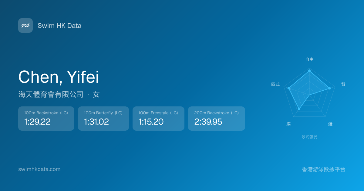 此圖表根據你所有比賽成績計算,顯示你在各泳式的相對強弱,僅供參考。繼續努力,每一次練習都會讓你更快更強!💪