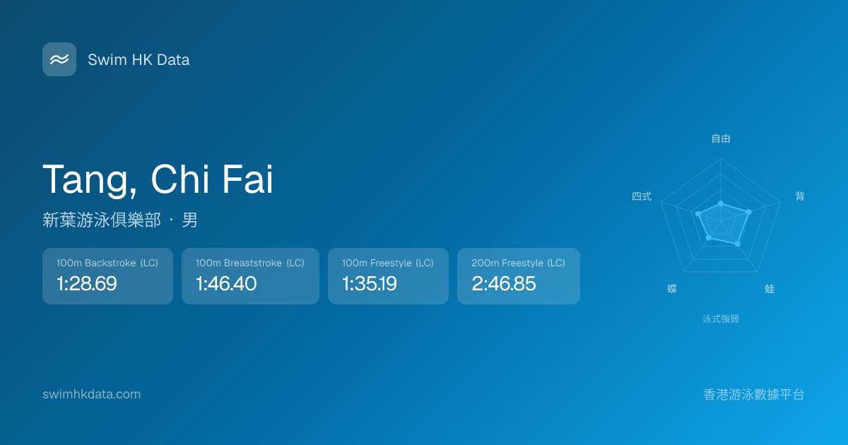 此圖表根據你所有比賽成績計算,顯示你在各泳式的相對強弱,僅供參考。繼續努力,每一次練習都會讓你更快更強!💪