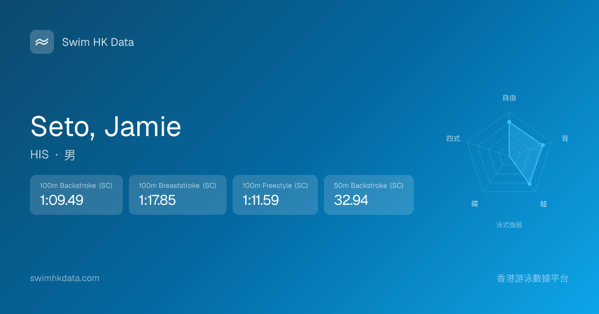 此圖表根據你所有比賽成績計算,顯示你在各泳式的相對強弱,僅供參考。繼續努力,每一次練習都會讓你更快更強!💪