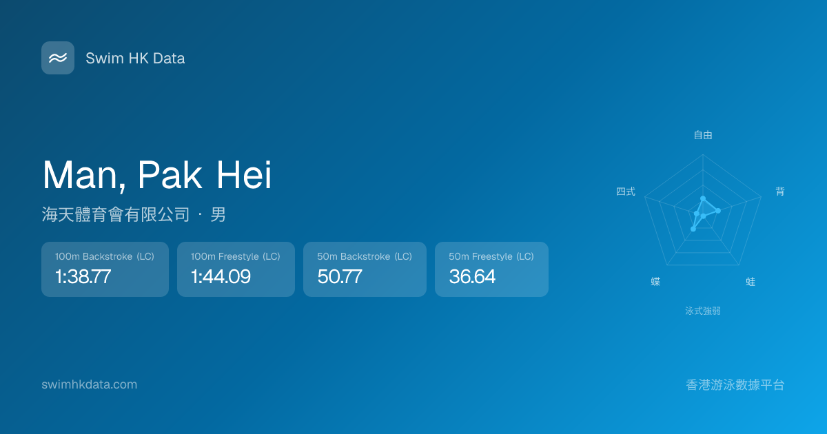 此圖表根據你所有比賽成績計算,顯示你在各泳式的相對強弱,僅供參考。繼續努力,每一次練習都會讓你更快更強!💪