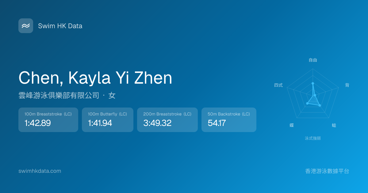 此圖表根據你所有比賽成績計算,顯示你在各泳式的相對強弱,僅供參考。繼續努力,每一次練習都會讓你更快更強!💪