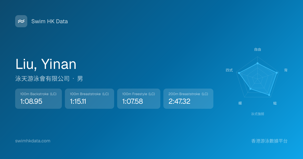 此圖表根據你所有比賽成績計算,顯示你在各泳式的相對強弱,僅供參考。繼續努力,每一次練習都會讓你更快更強!💪