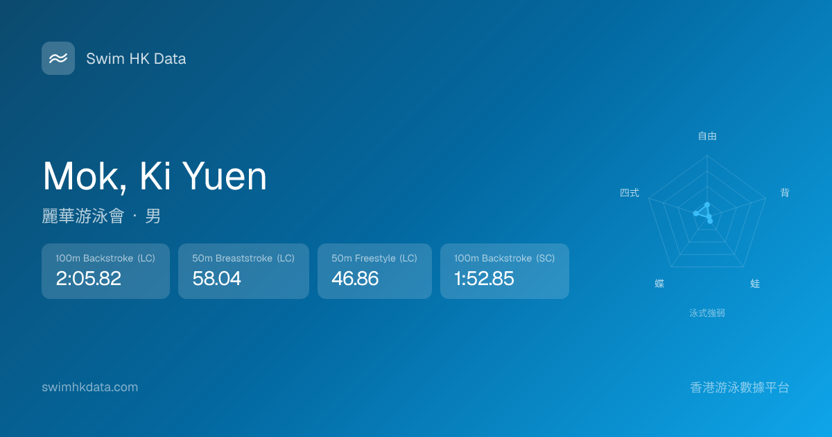 此圖表根據你所有比賽成績計算,顯示你在各泳式的相對強弱,僅供參考。繼續努力,每一次練習都會讓你更快更強!💪