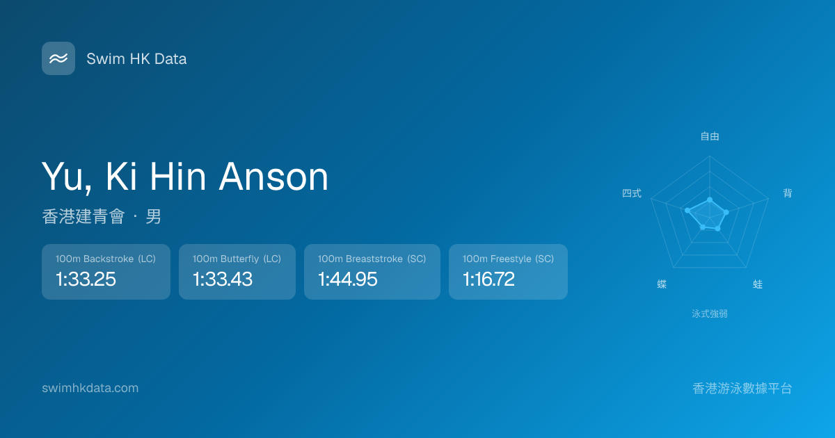 此圖表根據你所有比賽成績計算,顯示你在各泳式的相對強弱,僅供參考。繼續努力,每一次練習都會讓你更快更強!💪